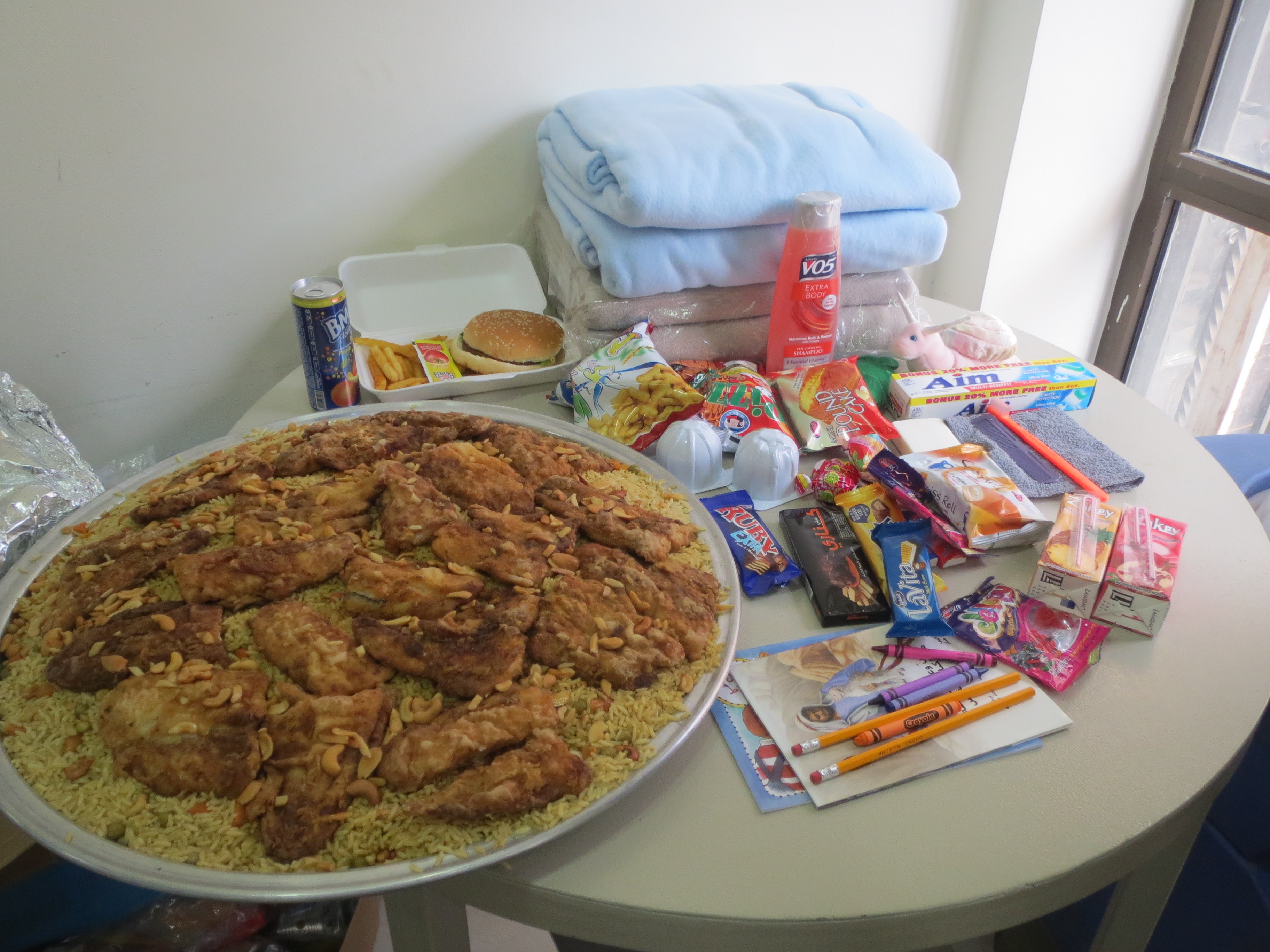 In Jordan each child received a plastic bag containing essentials such as tooth paste, brushes and soap as well as small toys, chips, cakes and some sweet candies. As the families were leaving, the children also received Christian themed work and coloring books.