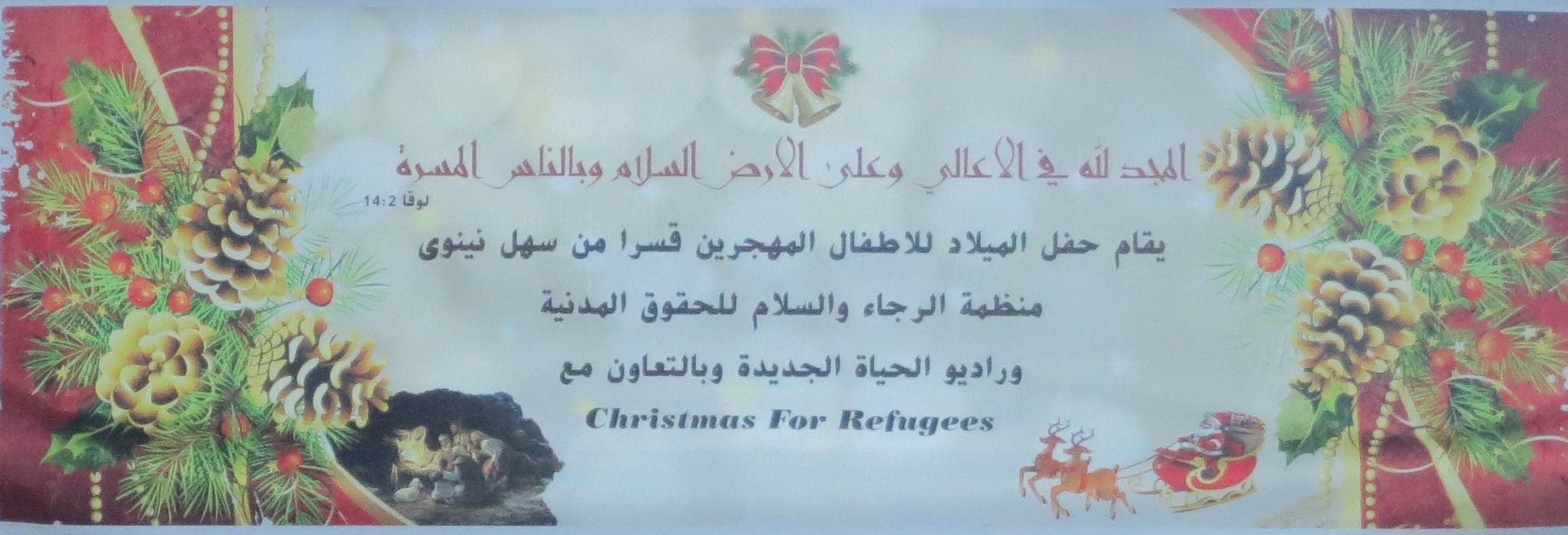 A large banner proclaiming Luke 2:14 “Glory to God in the highest, and on earth peace, good will toward men.” at a Christmas for Refugees event in Iraq.