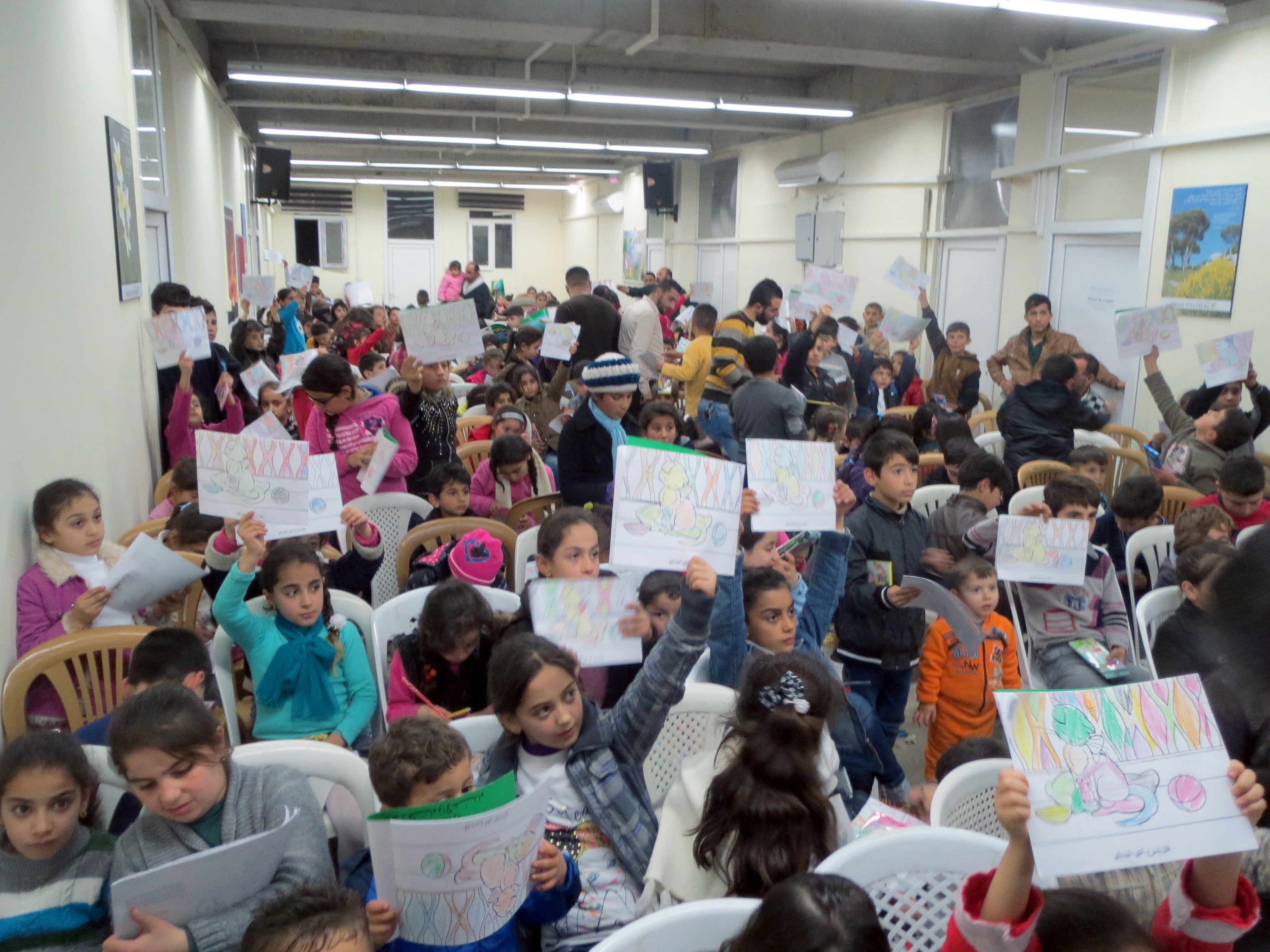 Part of the program included a coloring contest. Here children hold up their drawings hoping to win a small prize. Every child eventually received a gift.