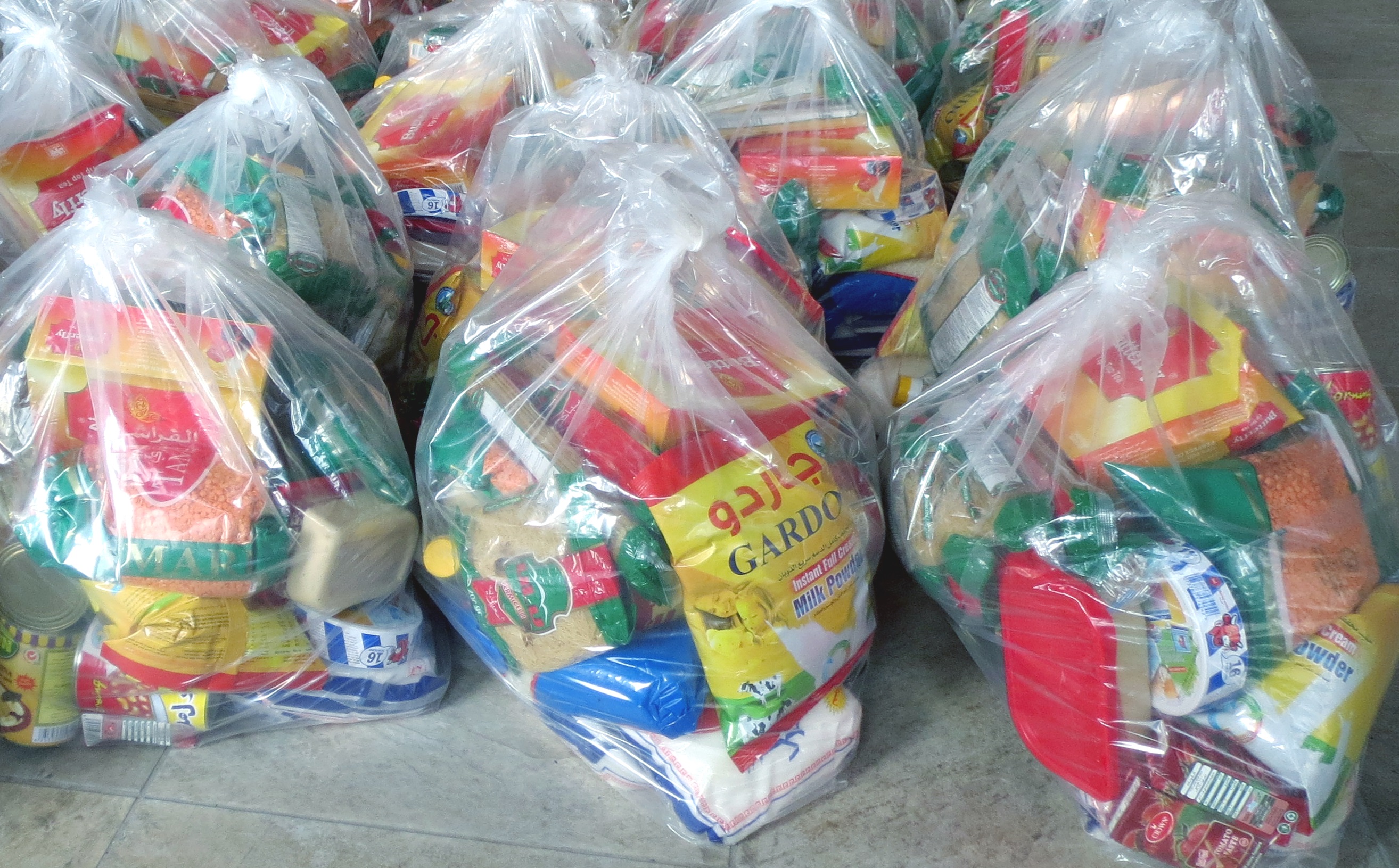 In Jordan strong plastic bags were filled with food staples including canned meat, cooking oil, rice and powdered milk. In Iraq cardboard boxes were used. It was a joy to the families to receive food that could last a week or more