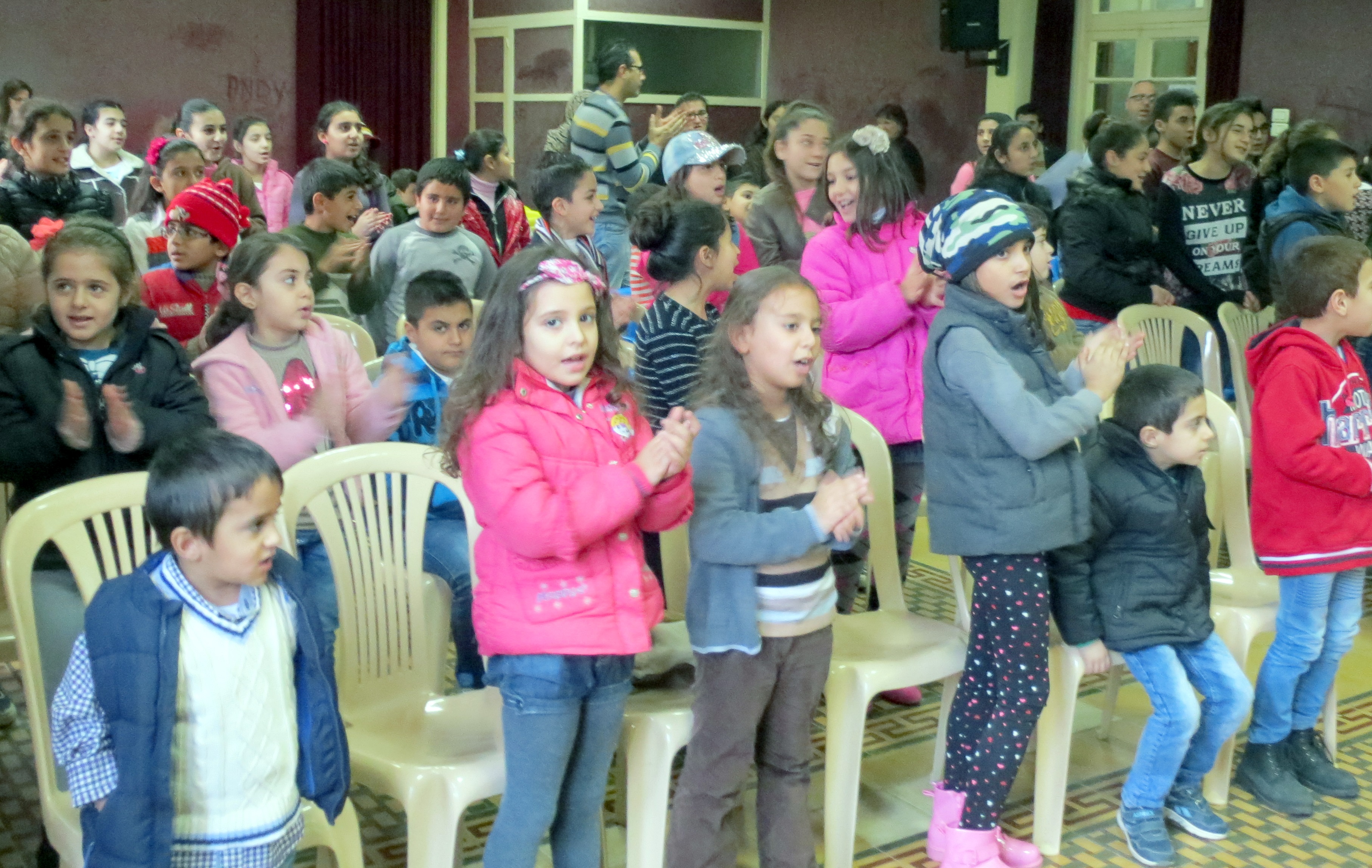 At this Christmas event north of Beirut one of the youngest girls began to cry when it was time to leave. At one point all chairs were stacked for the children to be able to play various organized games.